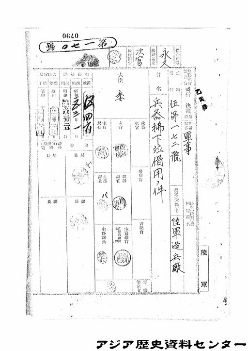 “Selling and loaning government ordnance” Japan Center for Asian Historical Records (JACAR) Ref.C01002385300, Otsushu, Category 2, Vol. 2, 1940 (National Institute for Defense Studies)