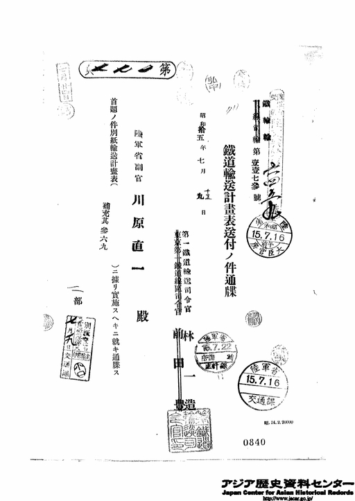 「鉄道輸送計画表送付の件」JACAR(アジア歴史資料センター)Ref.C04122263300、陸支密大日記 第26号 2/4 昭和15年(防衛省防衛研究所)