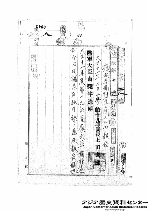 「応急準備計画に関する件」JACAR(アジア歴史資料センター)Ref.C02030105500、大正11年 「軍事機密大日記 其1 1/6」(防衛省防衛研究所)