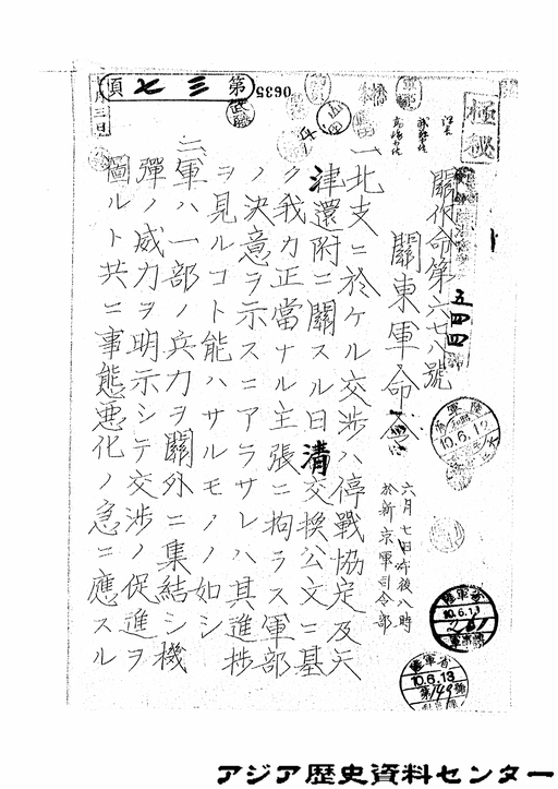 「関東軍命令」JACAR(アジア歴史資料センター)Ref.C01003068100、昭和10年 「満受大日記 11冊の内其7 陸満密終了目録 自6.13~7.30」(防衛省防衛研究所)