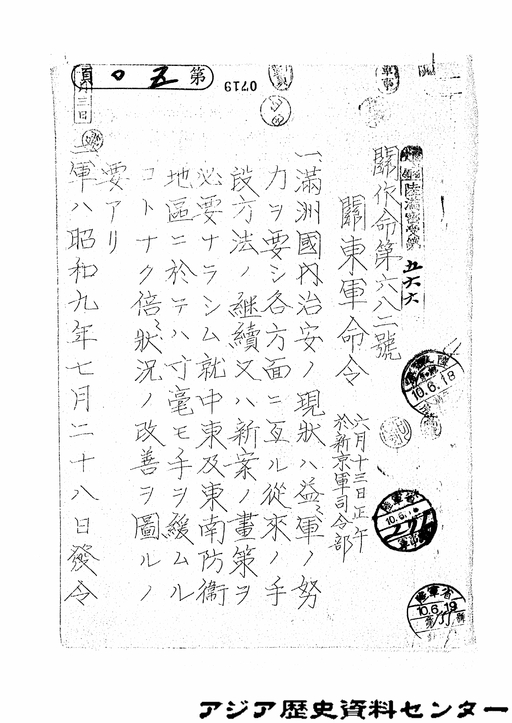 「関東軍命令」JACAR(アジア歴史資料センター)Ref.C01003069400、昭和10年 「満受大日記 11冊の内其7 陸満密終了目録 自6.13~7.30」(防衛省防衛研究所)