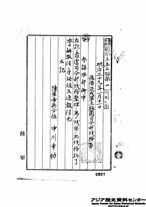 - 「明治38年12月21日~39年1月31日 臨号書類綴第1号1~566 参謀本部副官管」
