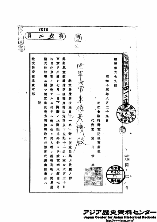 「同仁会臨時対支防疫事業部 北支那派遣防疫班員11名に対し便宜供与の件」JACAR(アジア歴史資料センター)Ref.C07090841200、支受大日記(普)其7 1/2 第7号 12冊の内 昭和13年自8月1日至8月26日(防衛省防衛研究所)