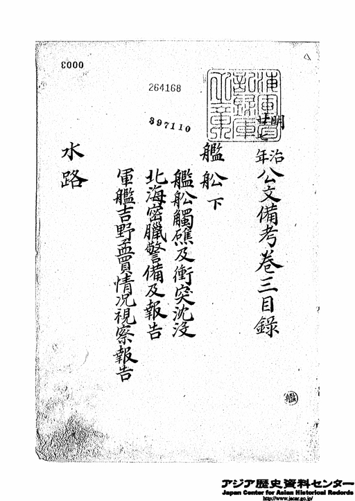 「目次 「公文備考 艦船 下 水路 兵員 巻3」」JACAR(アジア歴史資料センター)Ref.C06091009800、明治27年 公文備考 艦船下水路兵員巻3(防衛省防衛研究所)