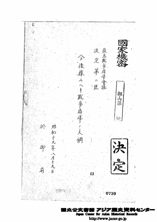 「6、昭和19年8月19日 今後採るへき戦争指導の大綱」JACAR(アジア歴史資料センター)Ref.C12120226900、重要国策決定綴 其6 昭和19年8月4日~20年3月29日(防衛省防衛研究所)