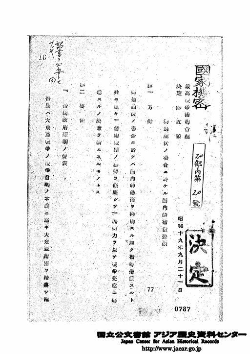 16、昭和19年9月21日 独逸屈伏の場合に於ける国内的措置要綱