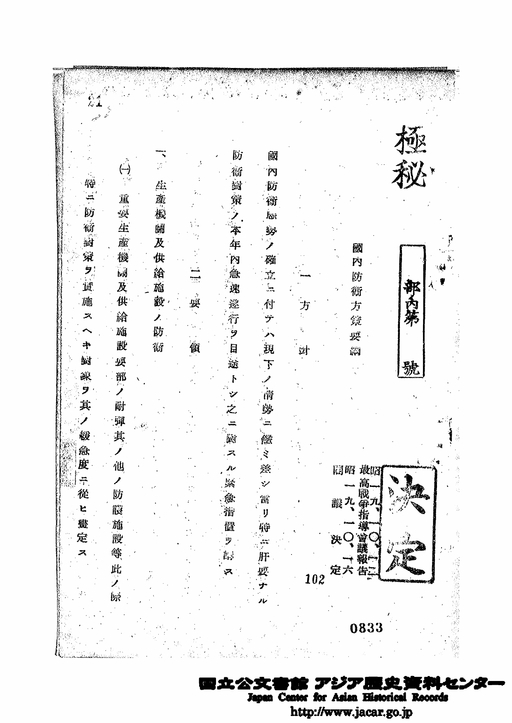 「21、昭和19年10月12日 国内防衛方策要綱」JACAR(アジア歴史資料センター)Ref.C12120228100、重要国策決定綴 其6 昭和19年8月4日~20年3月29日(防衛省防衛研究所)