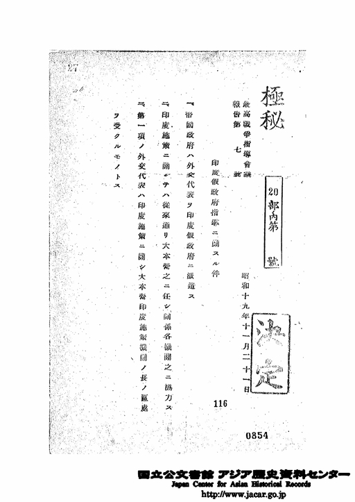 - 27、昭和19年11月21日 印度仮政府指導に関する件