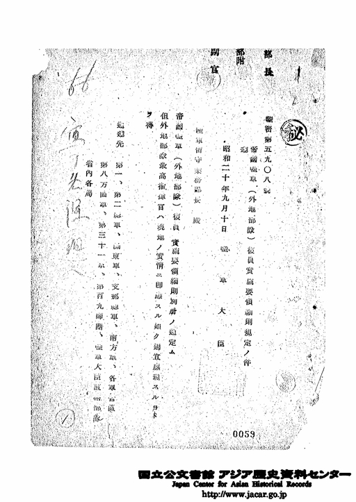 - 陸密第5908号 帝国陸軍(外地部隊)復員實施要領細則規定の件達