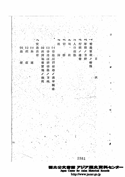 「目次「香港軍政の概要(素案) 昭和18年」」JACAR(アジア歴史資料センター)Ref.C13071188100、香港軍政の概要(素案) 昭和18年(防衛省防衛研究所)