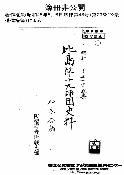 「表紙「比島第19師団史料」」JACAR(アジア歴史資料センター)Ref.C13071455000、比島第19師団史料(防衛省防衛研究所)