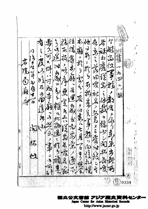 “Notification from Colonization Commission about the reduction of sections of Tokyo Branch Office before the merge, abolition, and dependence #各課和廃従# due to clerical works, May 21 ” Japan Center for Asian Historical Records (JACAR) Ref.C09120818200, Bureau janitors #Bureau janitor # 39 4 from , April to June 1881 (National Institute for Defense Studies)