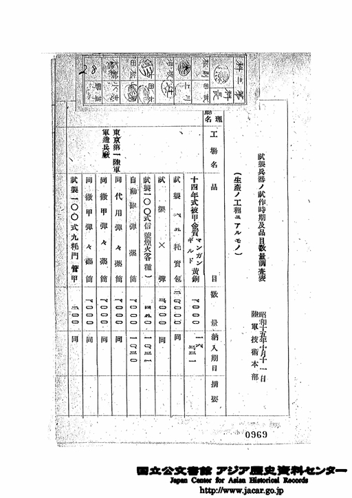 “29. Trial manufacture timing of the test production arms and articles number survey list October 11, 1940 Army Technical Headquarters” Japan Center for Asian Historical Records (JACAR) Ref.C12121639700, File for munition mobilization From November, 1939 to May, 1941 (National Institute for Defense Studies)