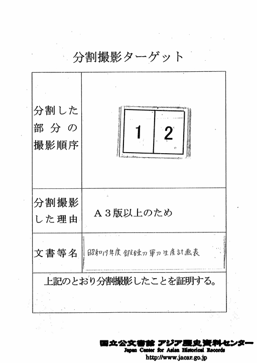 - [Data in English is under preparation] 15.昭和19年度鍜錬刀軍刀生産計画表 昭和19年4月15日 陸軍兵器行政本部 造兵部造兵課