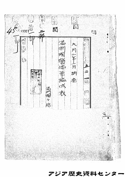 「満洲国警備軍編成表」JACAR(アジア歴史資料センター)Ref.C01002860200、昭和8年 「満密大日記 24冊の内其9」(防衛省防衛研究所)