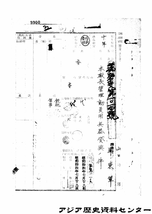 「本廠長管理動員用兵器貸与の件」JACAR(アジア歴史資料センター)Ref.C01003492300、昭和14年 満受大日記(密)第15号(防衛省防衛研究所)