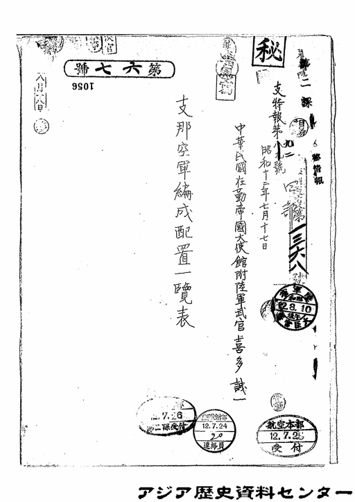 「支那空軍編成配置一覧表」JACAR(アジア歴史資料センター)Ref.C01004393300、密大日記 第12冊 昭和12年(防衛省防衛研究所)