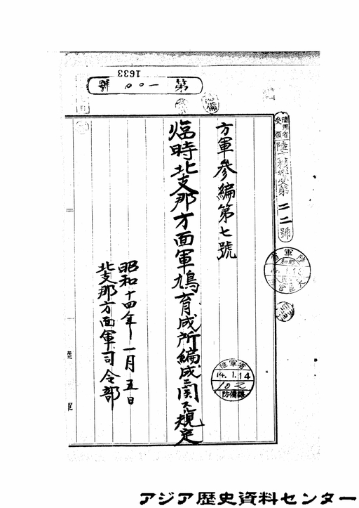 「臨時北支那方面軍鳩育成所編成に関する規定の件」JACAR(アジア歴史資料センター)Ref.C01005814100、陸支機密大日記 第1冊 3/3 第1号の3 共7冊 昭和14年(防衛省防衛研究所)