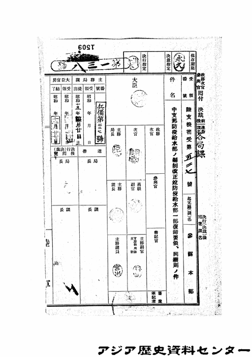 - 中支那防衛給水部の編制改正並防疫給水部一部復帰要領、同細則の件
