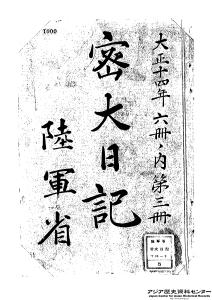 「表紙「密大日記 6冊の内3冊」」JACAR(アジア歴史資料センター)Ref.C03022700300、密大日記 大正14年 6冊の内 第3冊(防衛省防衛研究所)
