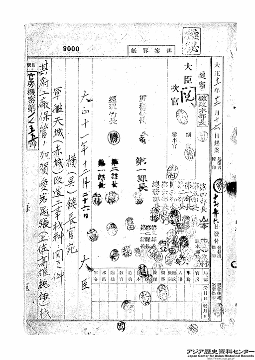 「軍艦天城(赤城)改造工事材料に関する件」JACAR(アジア歴史資料センター)Ref.C04015098600、公文備考 艦船1 巻26(防衛省防衛研究所)