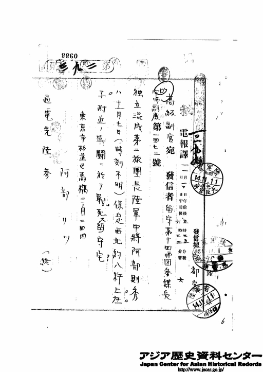 「留守第14師団参謀長 旅団長戦死の件」JACAR(アジア歴史資料センター)Ref.C07091367100、陸支受大日記(普)第11号 2/2 昭和14年自11月7日至11月30日(防衛省防衛研究所)