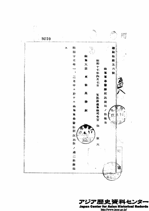 「陸軍軍事警察状況提出の件報告」JACAR(アジア歴史資料センター)Ref.C07092221400、陸支普大日記 第9号 1/2 昭和17年(防衛省防衛研究所)