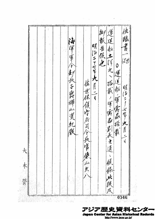 「兵器軍需品炭水の供給(3)」JACAR(アジア歴史資料センター)Ref.C08040472600、明治27・8年 戦史編纂準備書類 7(防衛省防衛研究所)
