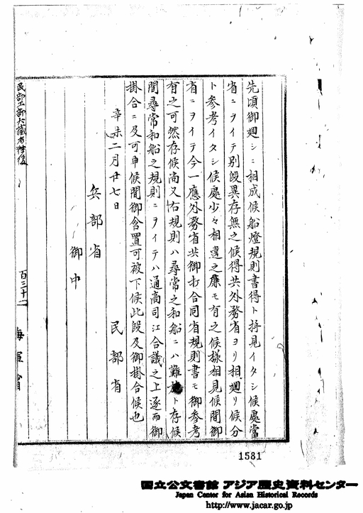 - 民部工部大蔵省往復 萬国普通船燈規則取調の件民部省掛合