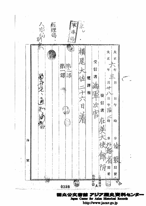 「倫敦着の件」JACAR(アジア歴史資料センター)Ref.C10100810700、大正6年 外国駐在員報告 巻1(防衛省防衛研究所)