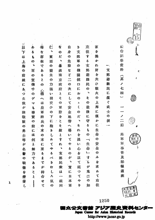 「(其の74)支那避難民に灑ぐ武士の涙」JACAR(アジア歴史資料センター)Ref.C11081083000、社会記事資料 昭和12(防衛省防衛研究所)
