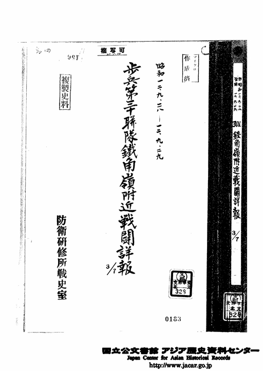 「表紙「歩兵第30連隊 鐵角嶺附近戦闘詳報」 昭和12年9月28日~昭和12年9月29日」JACAR(アジア歴史資料センター)Ref.C11111195000、歩兵第30連隊 鐵角嶺附近戦闘詳報 昭和12年9月28日~昭和12年9月29日(防衛省防衛研究所)