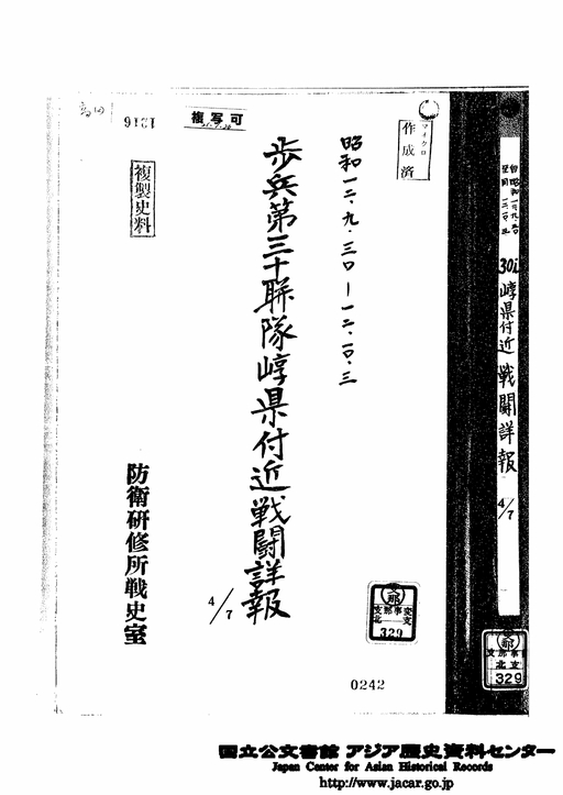 - 表紙「歩兵第30連隊 崞県付近戦闘詳報 4/7」 昭和12年9月30~昭和12年10月3日