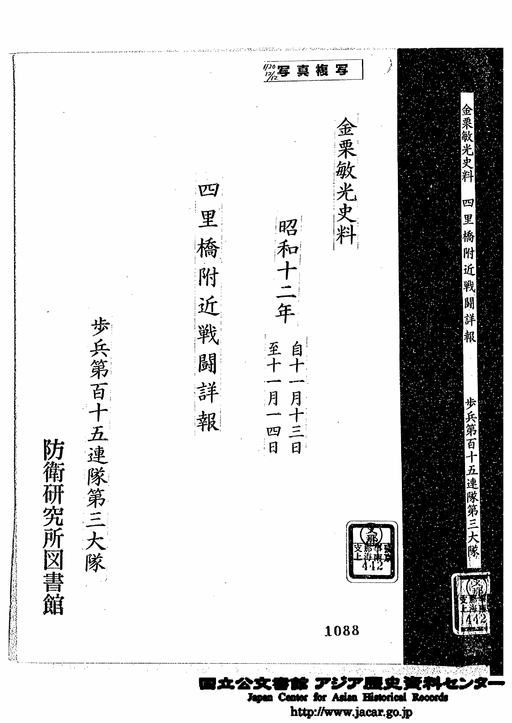 「表紙「金栗敏光史料 四里橋附近戦闘詳報 歩兵第115連隊第3大隊」」JACAR(アジア歴史資料センター)Ref.C11112026600、金栗敏光史料 四里橋附近戦闘詳報 歩兵第115連隊第3大隊(防衛省防衛研究所)