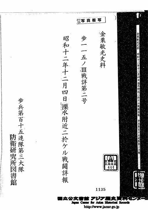 「表紙「金栗敏光史料 歩115ノⅢ戦詳第2号 溧水付近に於ける戦闘詳報 歩兵第115連隊第3大隊」」JACAR(アジア歴史資料センター)Ref.C11112027200、金栗敏光史料 歩115ノⅢ戦詳第2号 溧水付近に於ける戦闘詳報 歩兵第115連隊第3大隊(防衛省防衛研究所)