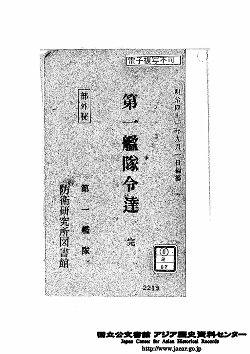 「表紙「第1艦隊令達 完」 明治41年9月」JACAR(アジア歴史資料センター)Ref.C12070139100、第1艦隊令達 完 明治41年9月(防衛省防衛研究所)