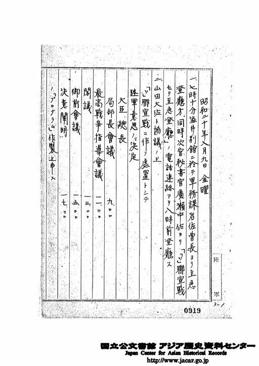 「昭和20年8月9日 金曜 機密戦争日誌」JACAR(アジア歴史資料センター)Ref.C12120362200、機密戦争日誌 昭和20年8月9日~20年8月15日(防衛省防衛研究所)