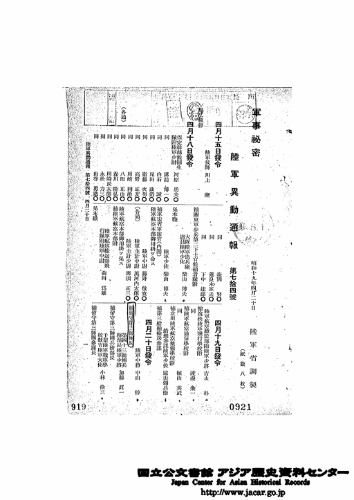 「第74号 昭和19年4月20日 陸軍異動通報」JACAR(アジア歴史資料センター)Ref.C12120907500、陸軍異動通報 2/6 昭19年(防衛省防衛研究所)