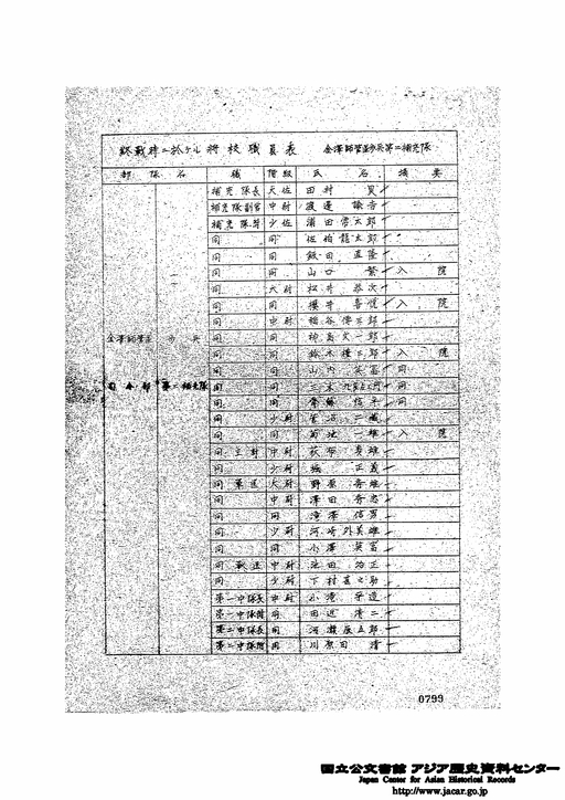 標題:終戦時ニ於ケル将校職員表 金沢師管区歩兵第2補充隊