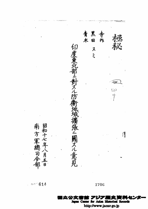 「印度東北部ニ対スル防衛地域拡張ニ関スル意見 昭和17年8月5日」JACAR(アジア歴史資料センター)Ref.C13071040800、上奏関係書類綴 巻2其1 昭和17年(防衛省防衛研究所)