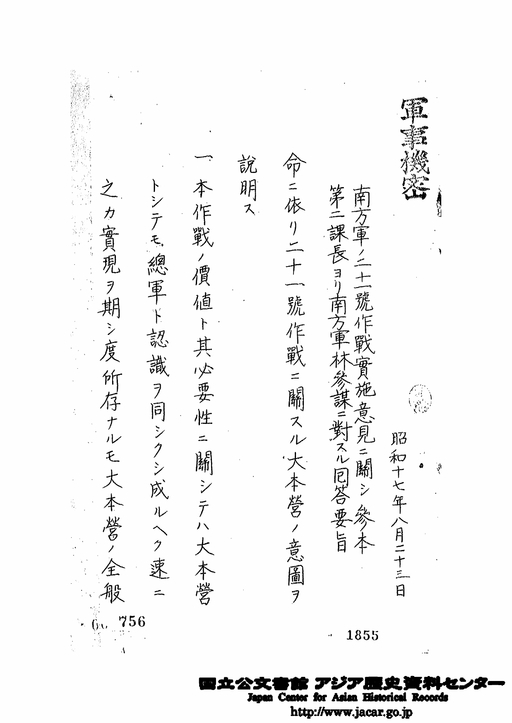 - 南方軍ノ21号作戦実施意見ニ関シ参本第二課長ヨリ南方軍林参謀ニ対スル回答要旨 昭和17年8月23日