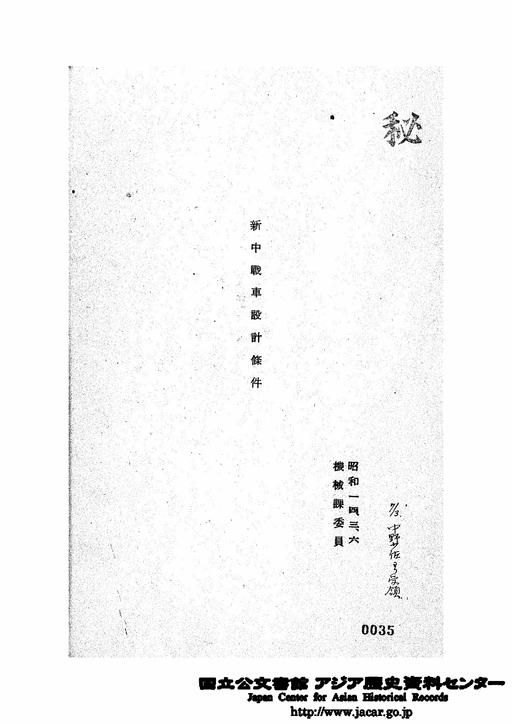 「新中戦車設計条件 昭和14年3月6日 機械課委員」JACAR(アジア歴史資料センター)Ref.C14010847500、戦車装備に関する綴 昭14(防衛省防衛研究所)